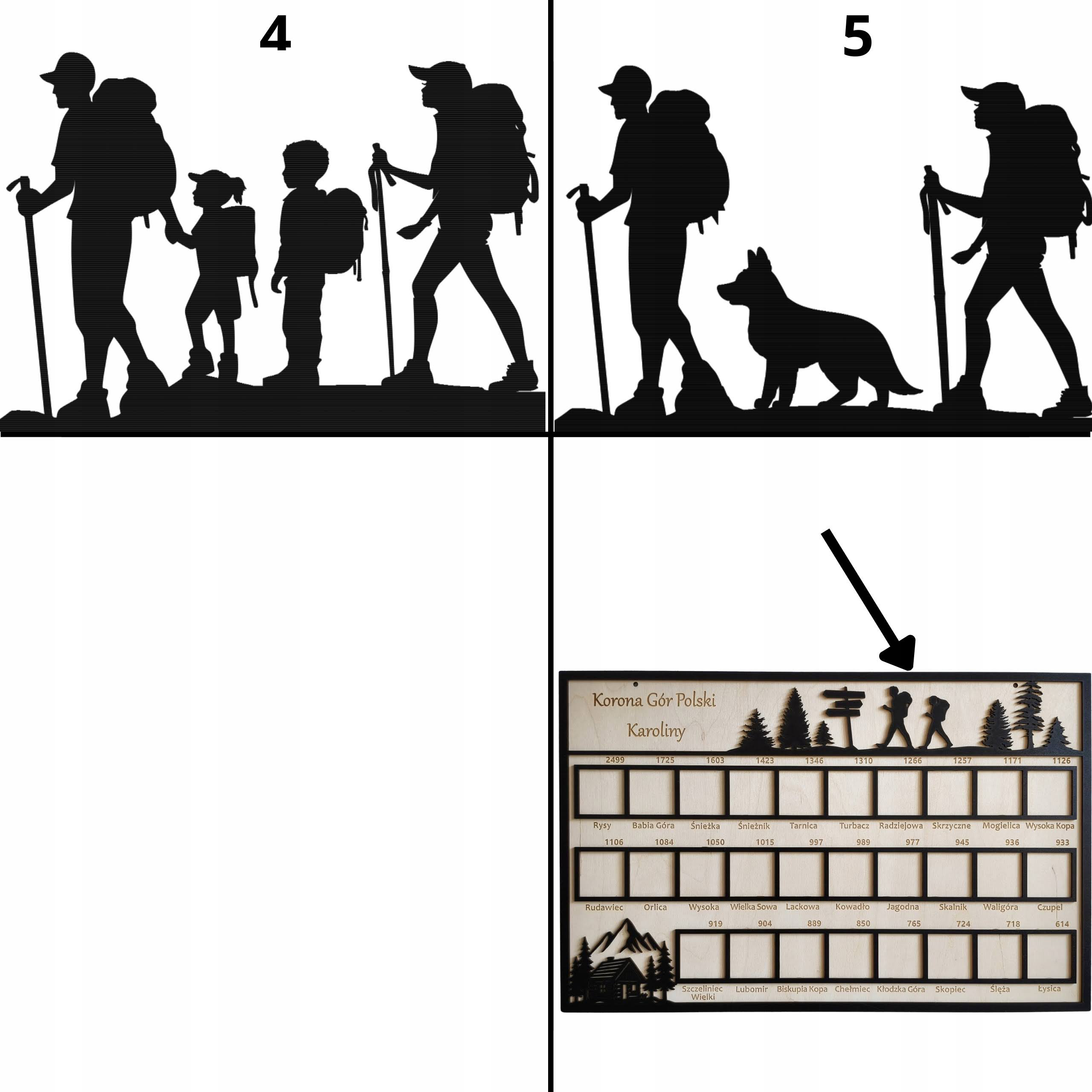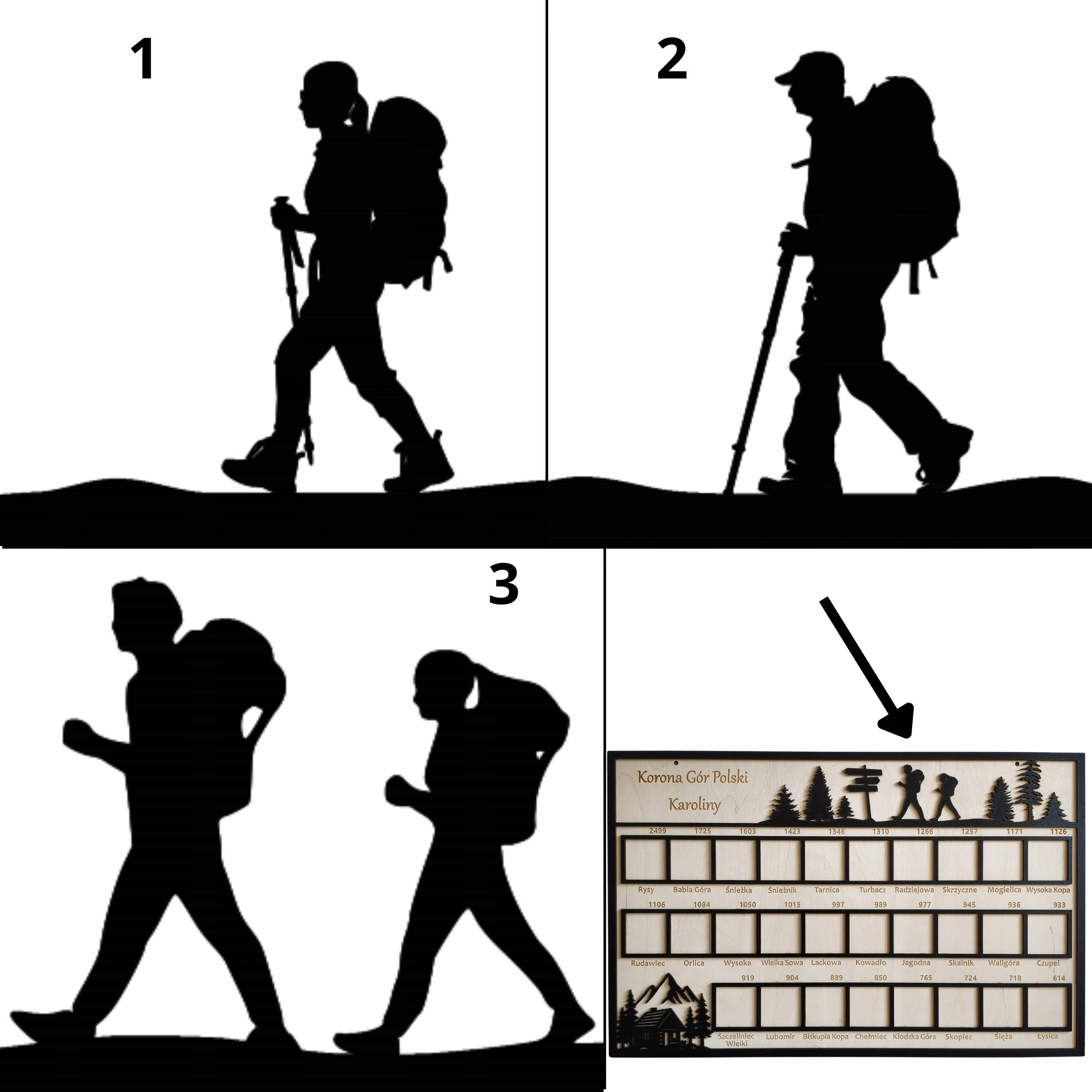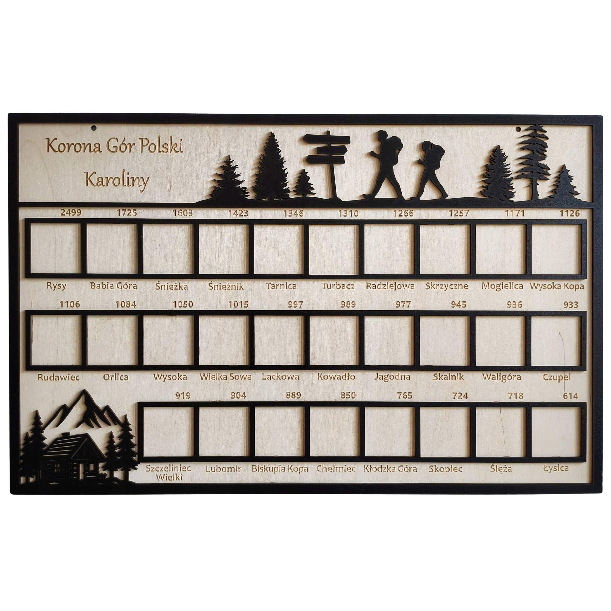 Drewniana tablica „Korona Gór Polski” została zaprojektowana jako estetyczna i funkcjonalna pamiątka dokumentująca zdobycie wszystkich 28 szczytów należących do Korony Gór Polski. Każdy szczyt posiada osobne miejsce na zdjęcie, co pozwala w przejrzysty sposób śledzić własne górskie osiągnięcia.