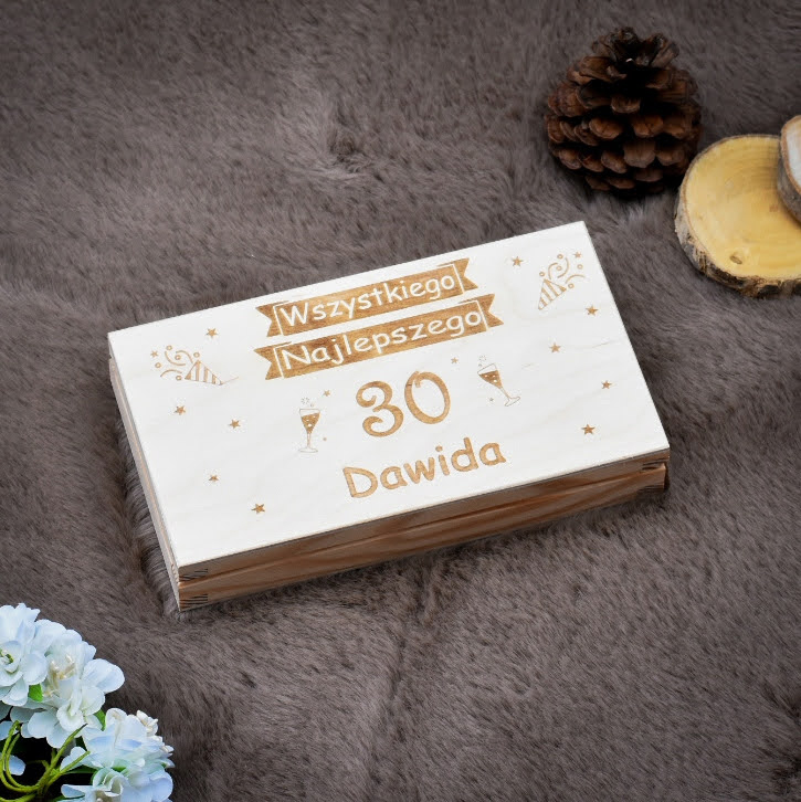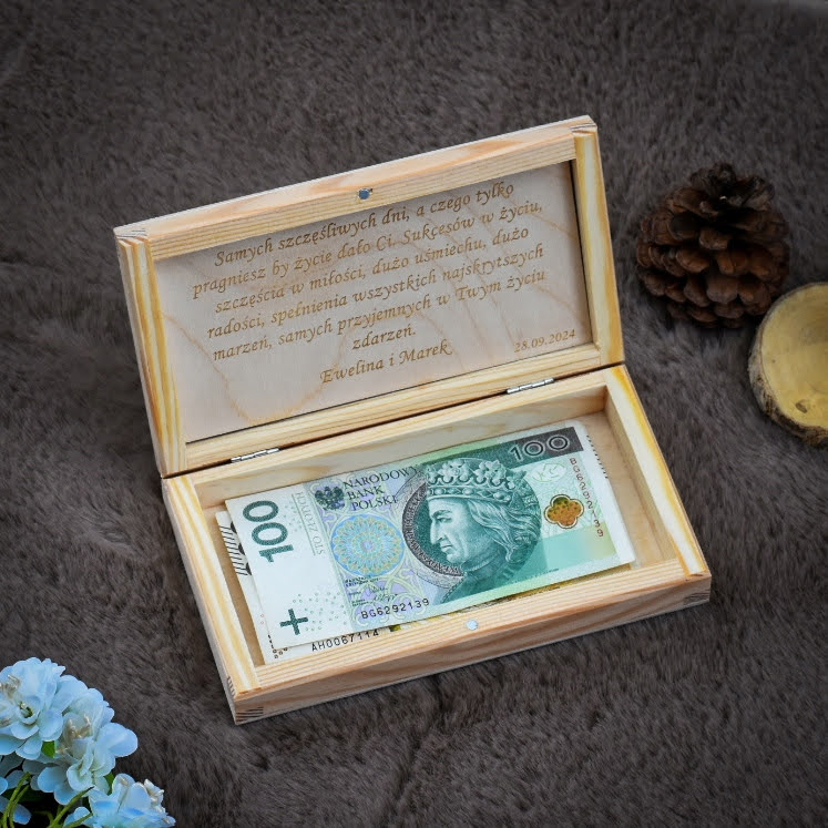 Drewniane pudełko na pieniądze to elegancka i trwała alternatywa dla tradycyjnej koperty. Personalizowana forma prezentu gotówkowego, która pełni jednocześnie funkcję pamiątki urodzinowej.